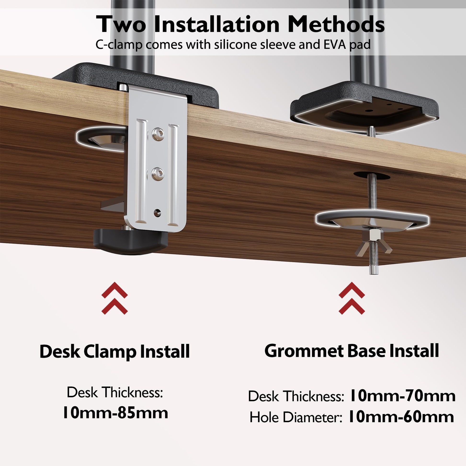 • ✅ Dual Installation Methods & Desk Space Management - Offering both C-Clamp and grommet mounting options, this monitor arm fits desk thicknesses from 10-85mm for C-Clamp installation and 10-70mm for grommet. By freeing up valuable desk space, it keeps your workspace clean and organized, while the concealed cable management system ensures a tidy, clutter-free environment for enhanced productivity.