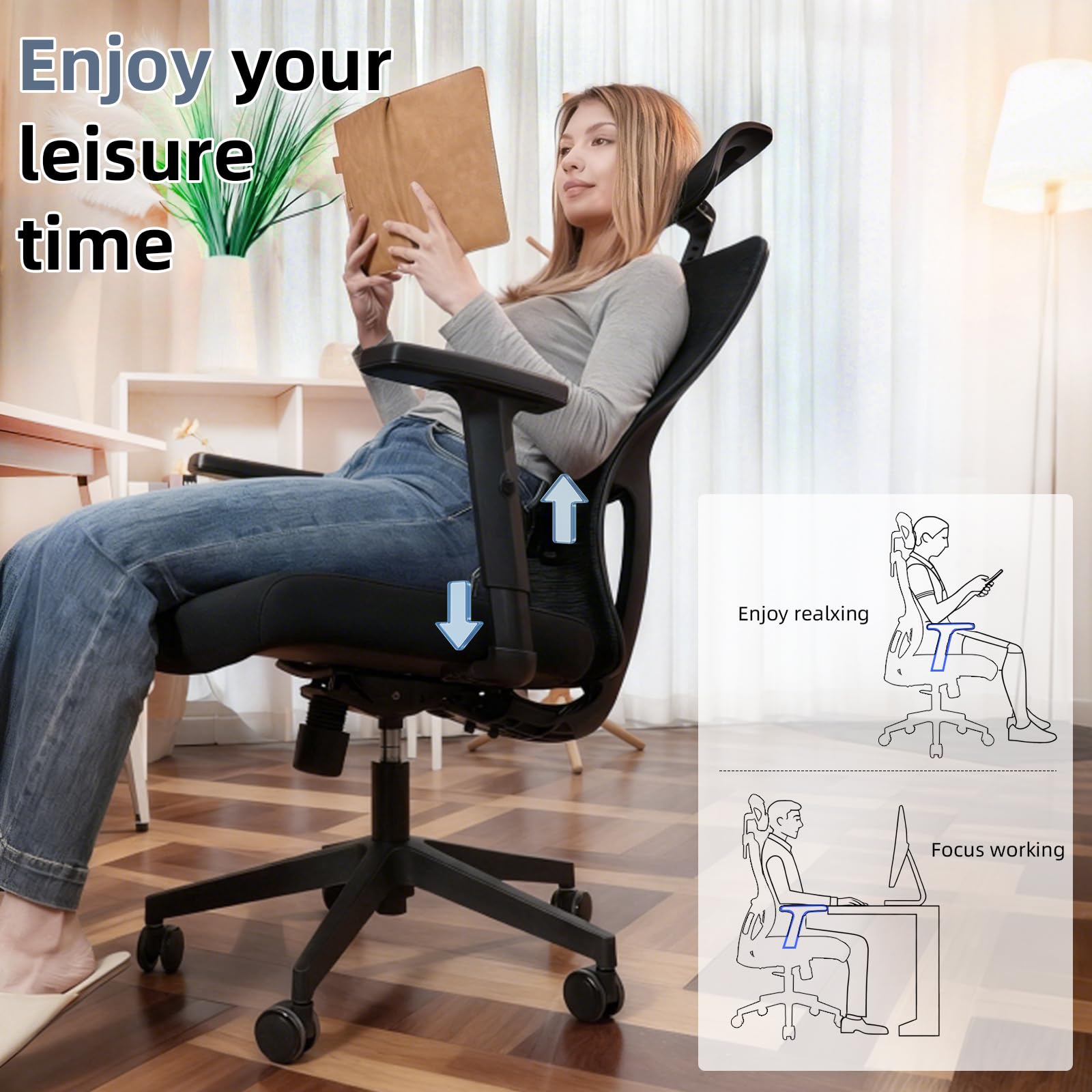 • 📌[ERGONOMIC CHAIR]: The S-shaped ergonomic backrest precisely follows the spine's natural curve, while the adjustable lumbar support provides powerful core support for the waist and abdomen. The high-resilience breathable mesh backrest stays cool and sweat-free year-round. The headrest offers 10cm height adjustment + angle rotation to accommodate different heights. Say goodbye to backaches and stiff necks—designed specifically for prolonged sitting.