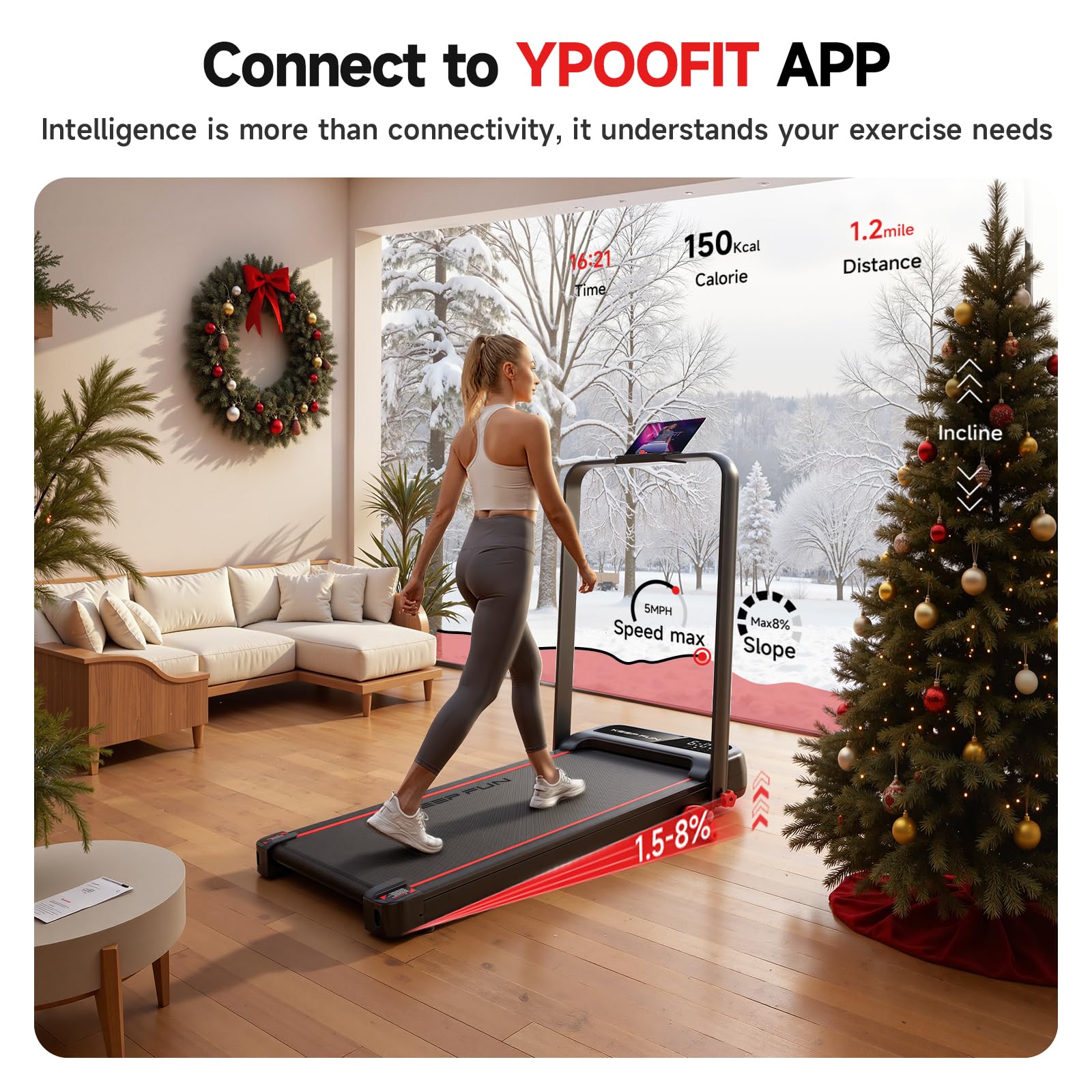 • 【KEEP FUN Treadmill with APP】 Connect the Ypoofit app to link our Home Office Treadmill through Bluetooth, so you can join course training and more realistic running track. Use the phone holder to watch videos or chat with friends. The remote control is convenient to adjust the speed of movement and stop instantly. Smart Ypoofit APP control is perfect to record exercise data and running with other users.