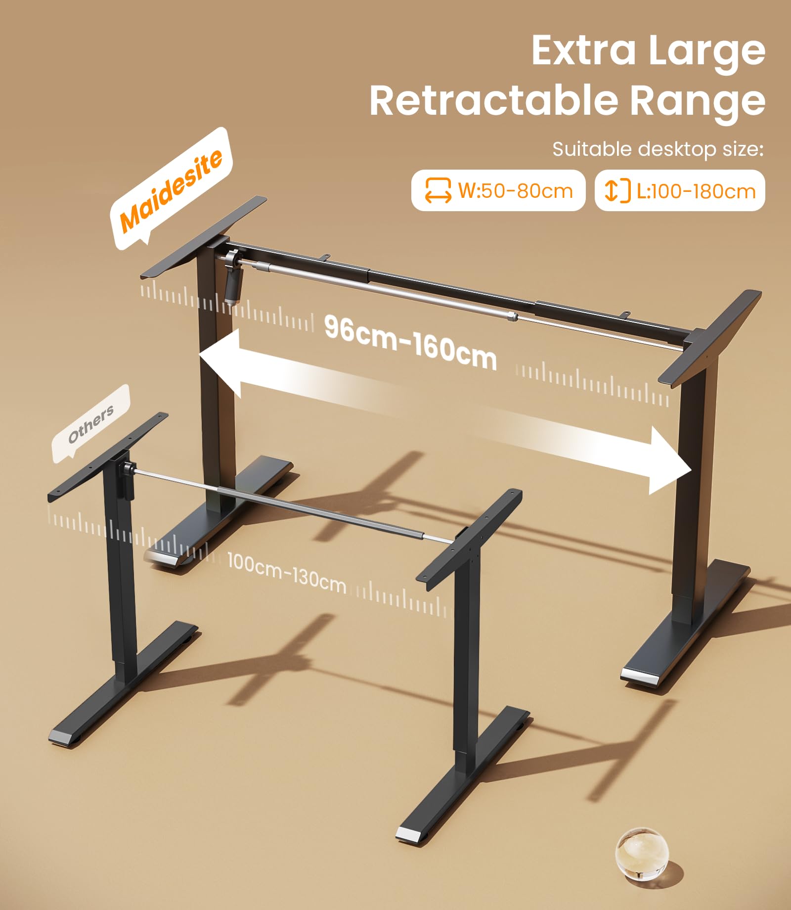 • 【Ideal Adjustable Range】 The MAIDeSITe standing desk frame comes with the largest adjustment range on the market, offering a height range of 72-120 cm and a width range of 96-160 cm. It is suitable desktop for widths of 100-180 cm and depths of 50-80 cm and offers maximum flexibility in DIY desk.